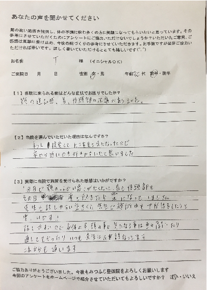 過去には他の治療法も試していたのですが、なかなか改善せず、ほとんど諦めていました。今回もよくなるかどうか半信半疑で通い始めました。