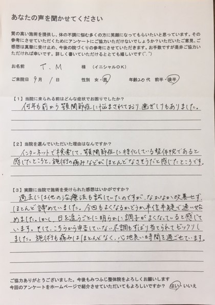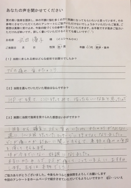 1回目の施術で顎のしんどい感じはなくなって、首も後頭部もその日、寝て起きたら楽になっていました。
