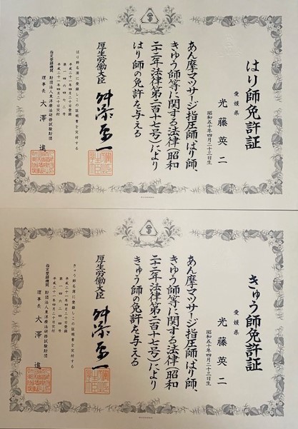 院長は国家資格である鍼灸師の免許を取得しています。この業界で働くための足掛かりとして、トレーナーの資格を1年かけて取得。その後、整形外科で働きながら、国家資格である鍼灸師の資格を3年間かけて取得。整形外科と整骨院で10年以上の臨床経験を経て、2014年にみつふじ整体院を開院しました。