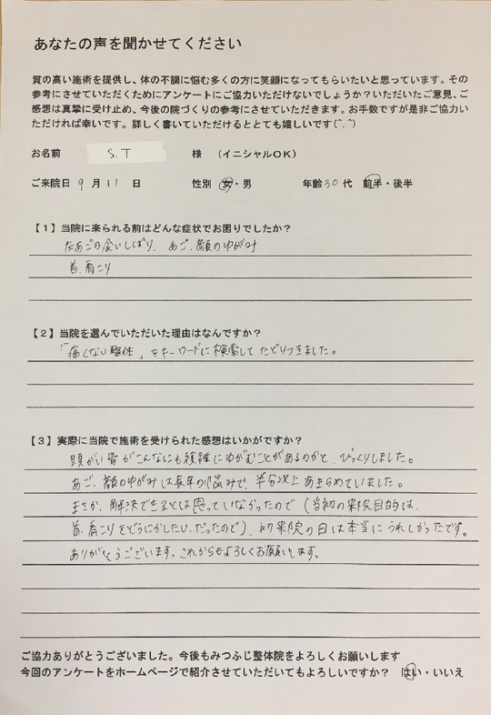 まさか解決できるとは思っていなかったので(当初の来院目的は、肩・首こりをどうにかしたいだったので)、初来院の日は本当にうれしかったです。