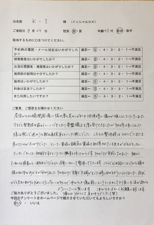 産後から仙腸関節痛に悩み度々足のしびれや排便時に痛みが強くなったりしていました。今までも整骨院や筋力トレーニングをしたり骨盤矯正を度々受けてきましたが、その時は良くなった様な感じで週のうち数日通院するといった感じでした。